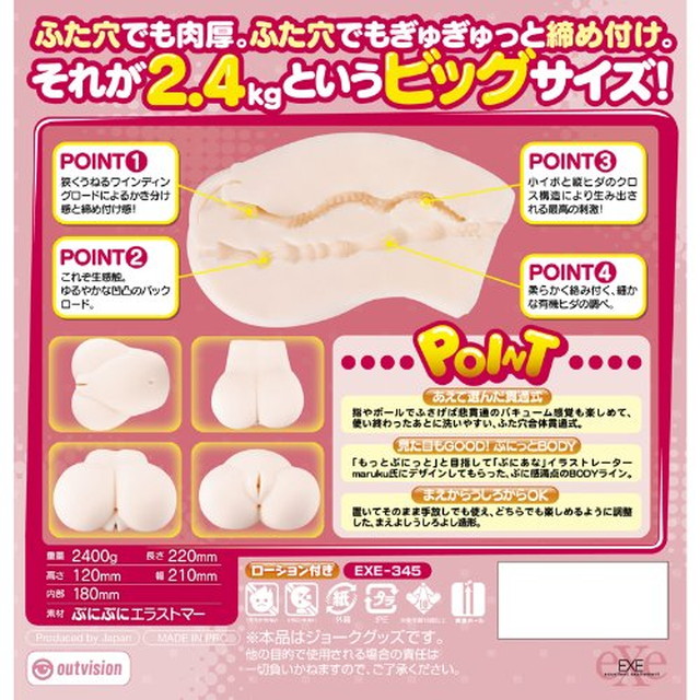 ぷにあな絵師「maruku氏」のボディデザインを忠実に再現した重量級ホールが登場!重さはなんと2.4kg!その造形、大きさはまさに本物!前からでも後からでも挿入可能な2穴合体貫通式。使用後も洗いやすくなってます。オリジナル書き下ろし2点を含めた、超美麗イラストCG集付き!