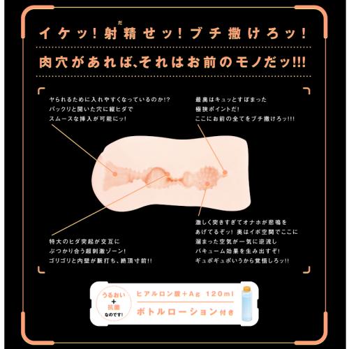 イケッ!射精(だ)せッ!ブチ撒けろッ!肉穴があれば、それはお前のモノだッ!!! ベタつきと臭いを抑えた、やさしい日本の素材を使用した満足度200%のオナホールです。300g超の肉厚感とこだわりの内部構造で絶頂必至! ヒアルロン酸+Ag配合120mlボトルローションの豪華セット。パッケージイラスト:わざきた